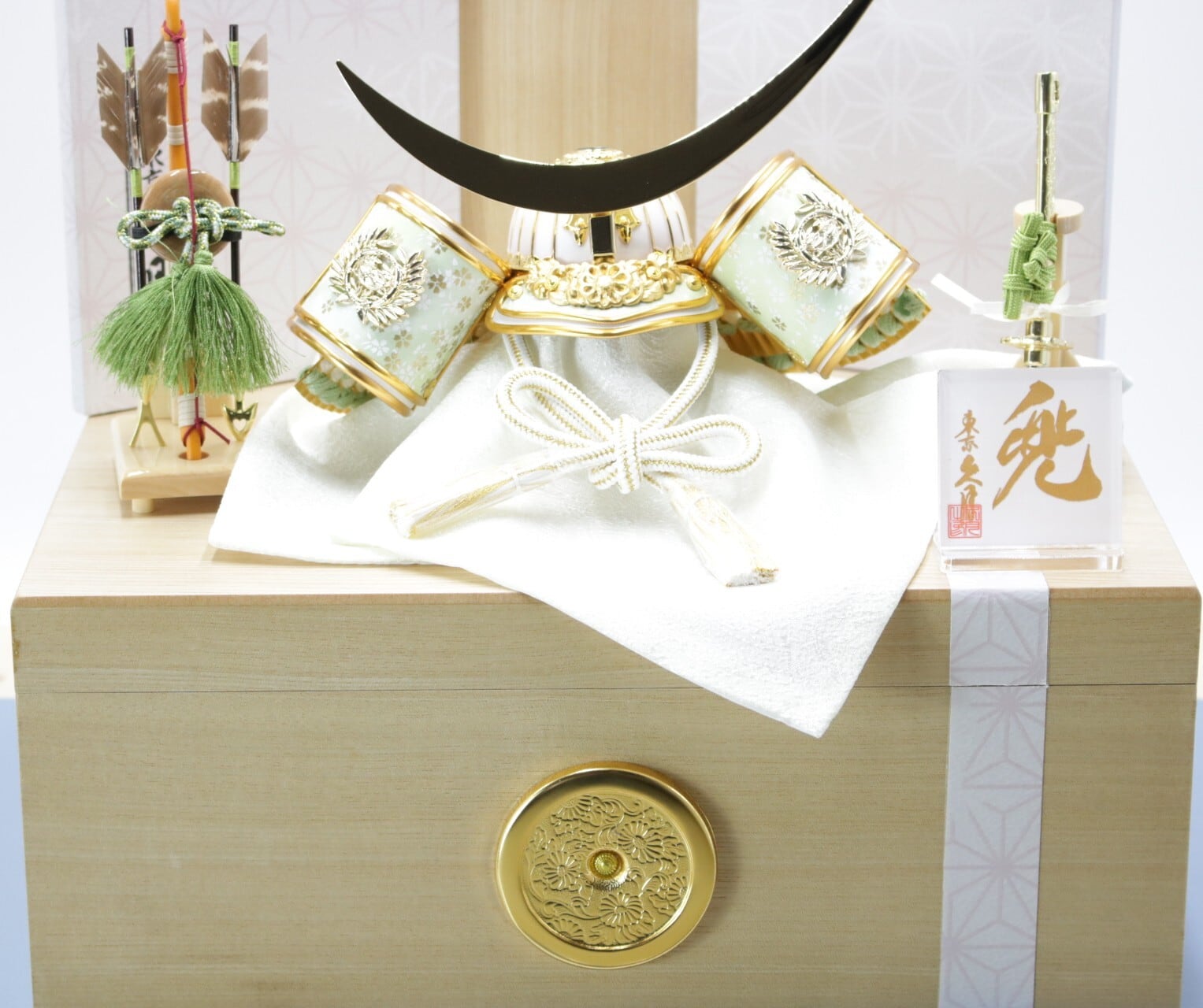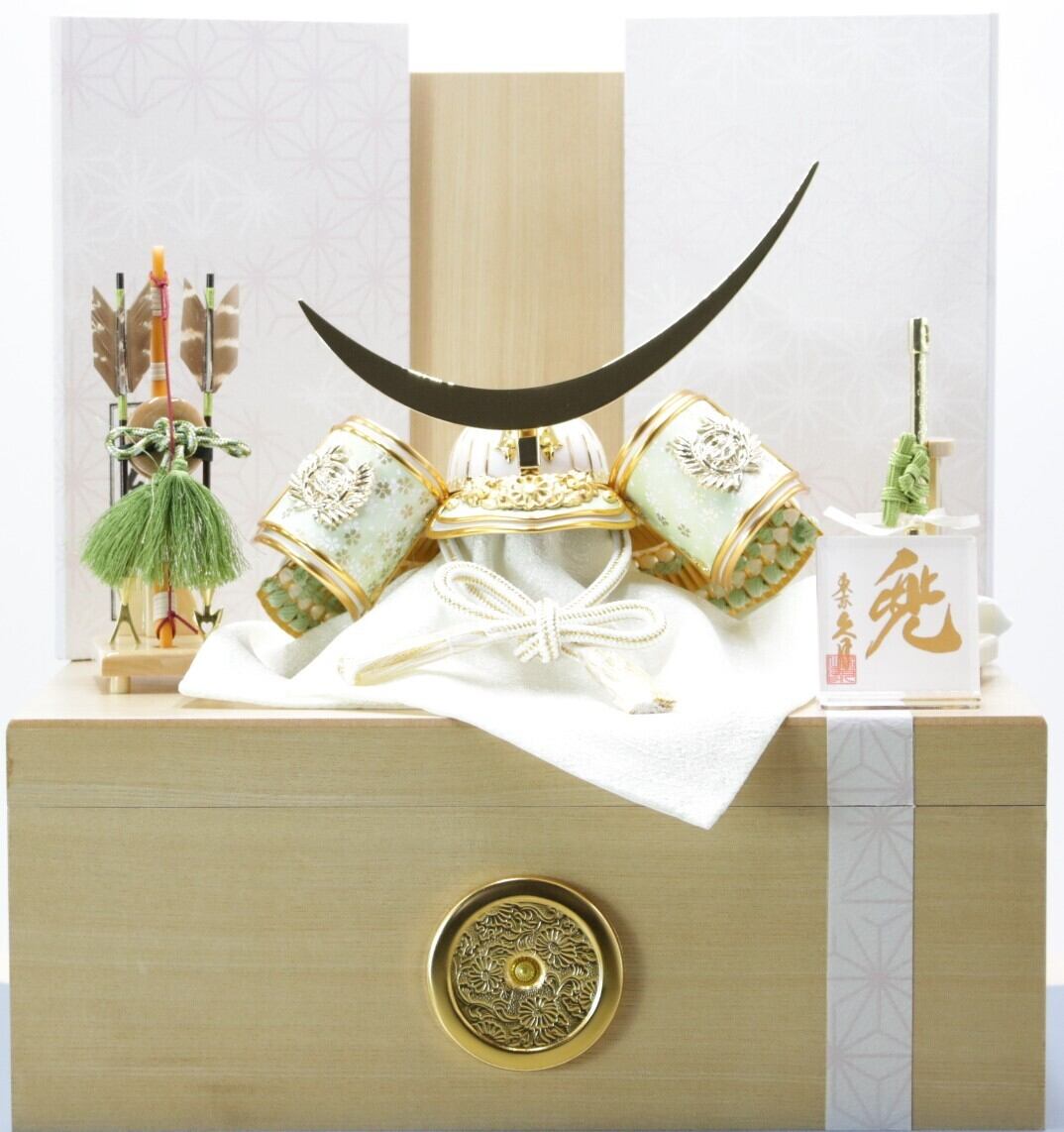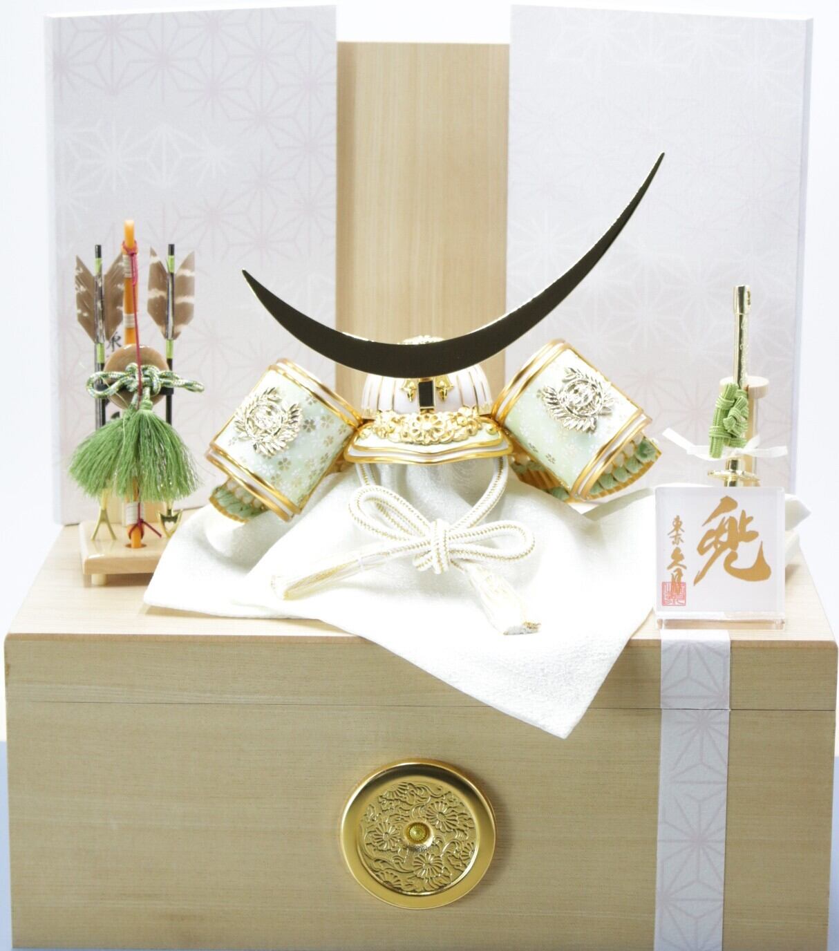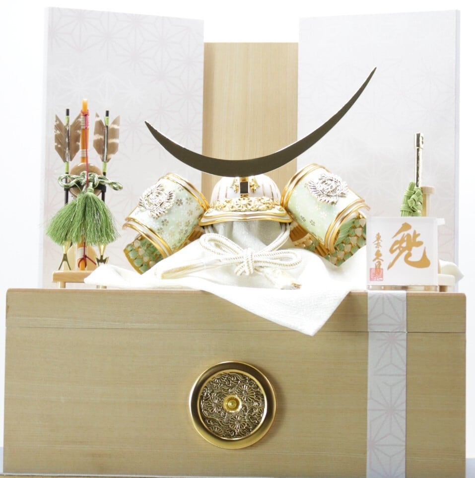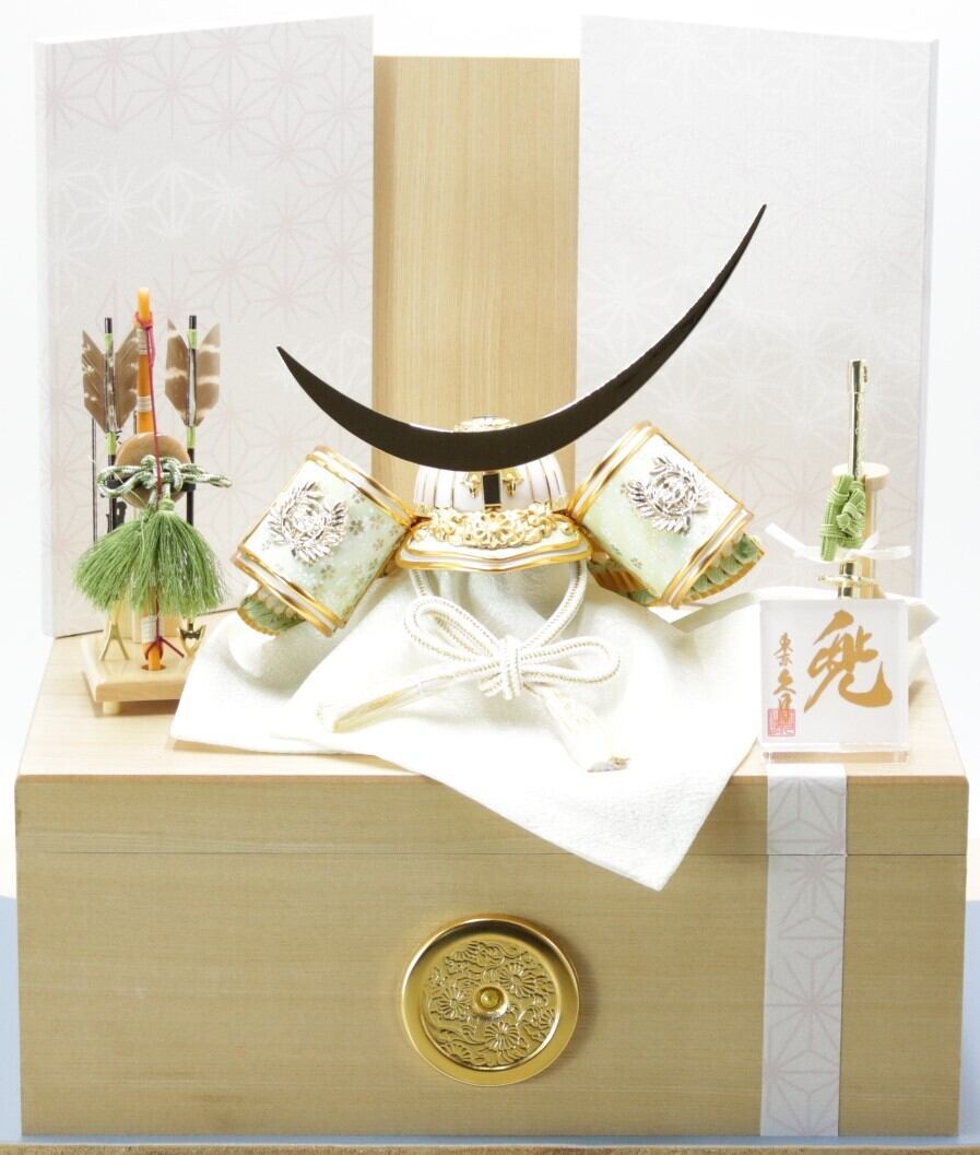 白と金のコントラストが明るい雰囲気を出している兜飾りです。