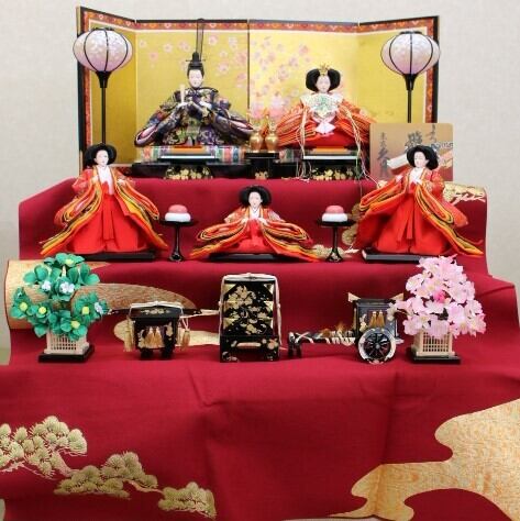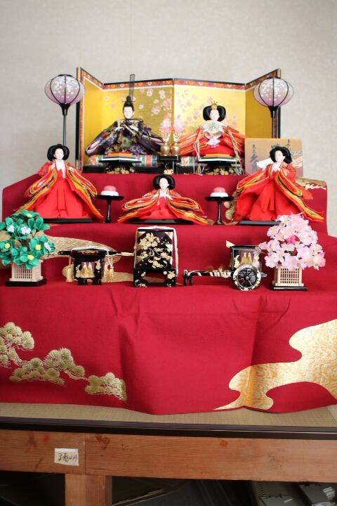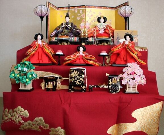 伝統的な赤毛氈を引いた三段飾りになります。